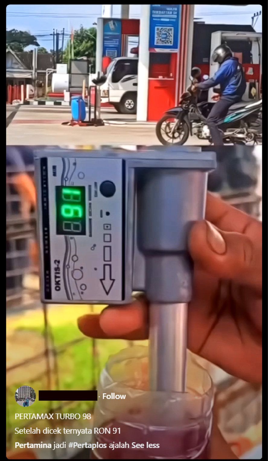 Di akhir video, sebuah foto memperlihatkan sebuah alat OKTIS-2 sedang digunakan untuk mengecek Research Octane Number (RON) yang menunjukkan RON berada di angka 91.