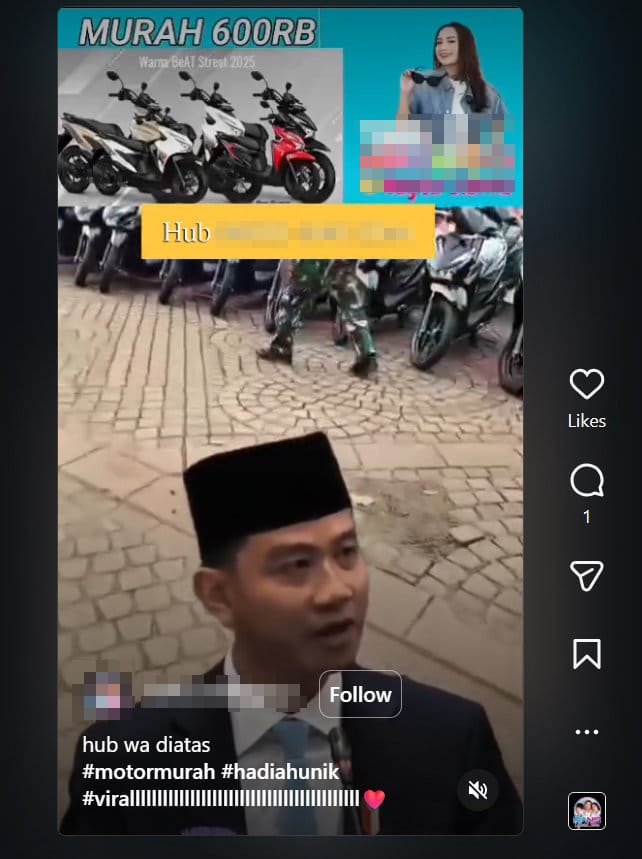 Video tersebut diunggah oleh akun Instagram @adm_heriwijaya (arsip) pada Selasa (2/12/2025). Tayangan berdurasi 47 detik tersebut menampilkan gambar Gibran yang tidak utuh dengan latar belakang terlihat seperti di parkiran motor yang memperlihatkan berbagai jenis motor. Gibran mengumumkan pendaftaran promo berbagai motor yang dijual murah tersebut.