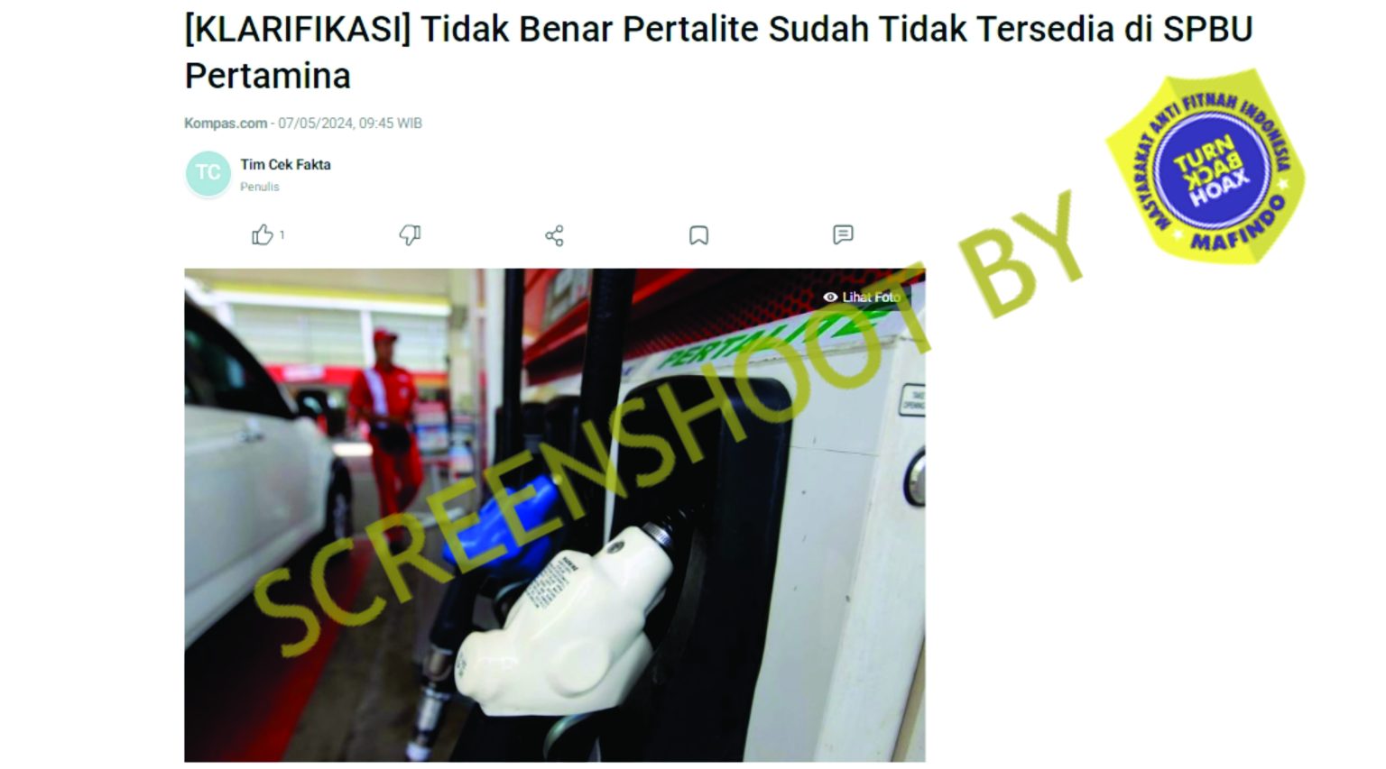 Muncul sebuah klaim di Facebook pada 5 Mei 2024 mengenai klaim yang mengatakan jika stasiun pengisian bahan bakar umum (SPBU) yang dikelola oleh Pertamina telah menghentikan penjualan bahan bakar minyak (BBM) jenis Pertalite.