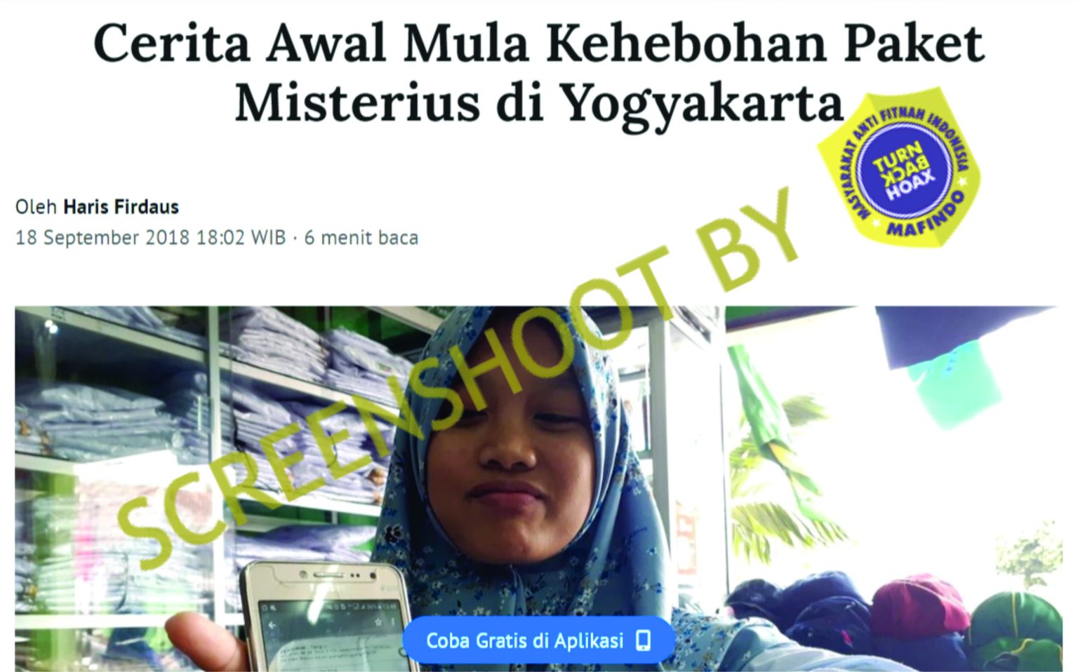 Ditemukan sebuah unggahan di Facebook pada 30 Mei 2024 berisi konten mengenai kiriman paket dengan sistem cash on delivery (COD) di Yogyakarta yang diklaim dari sindikat pengedar narkoba China. Paket itu dikirimkan ke rumah, padahal penerima tidak pernah memesan. Kemudian, kurir akan memaksa memfoto sebagai konfirmasi ke pengirim.