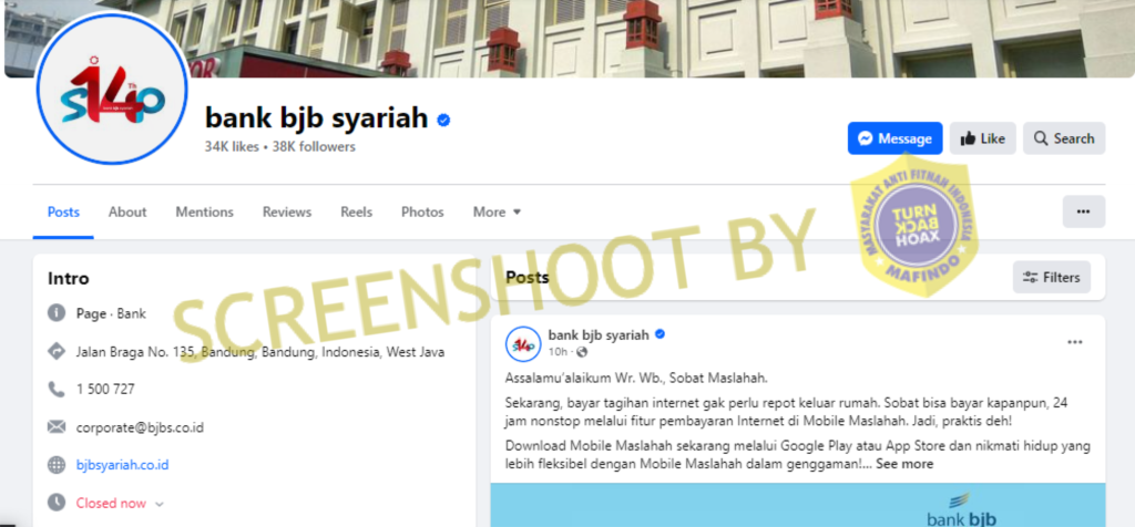 Namun, akun tersebut bukan merupakan Facebook resmi Bank BJB Syariah, berdasarkan pencarian ditemukan jika akun resmi Bank BJB Syariah di Facebook adalah facebook.com/bankbjbsyariah, akun tersebut telah mendapat verifikasi centang biru dari Facebook.