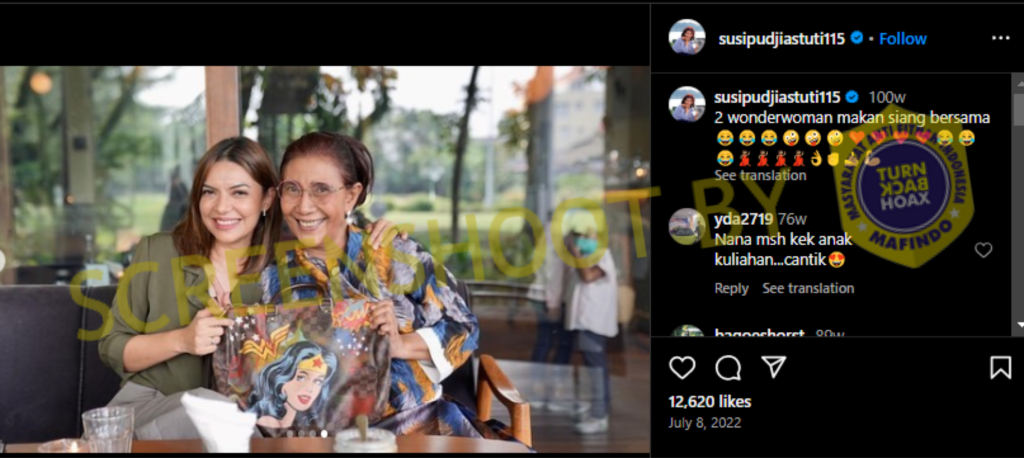 Untuk memastikan kebenaran dari foto yang beredar tersebut, dilakukan pencarian dengan Google Lens yang akhirnya didapatkan hasil jika foto tersebut bersumber dari akun Instagram milik Susi Pudjiastuti (@susipudjiastuti115) yang diunggah pada 8 Juli 2022 yang lalu.