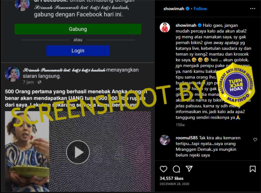 Sebelum-sebelumnya turnbackhoax.id juga sudah sering menemukan unggahan-unggahan serupa mengenai adanya akun yang mengatasnamakan Soimah mengaku sedang mengadakan giveaway berupa uang jutaan rupiah dan sepeda motor.