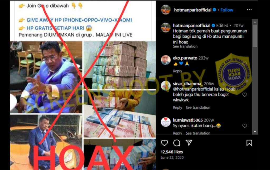 Faktanya berdasarkan akun Instagram resmi Hotman Paris (@hotmanparisofficial) ia pernah mengunggah sebuah konten berisi peringatan jika dirinya tidak pernah membuat undian atau giveaway uang di Facebook.