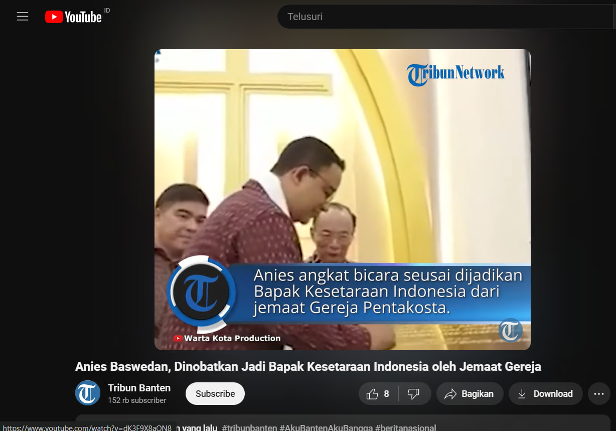 Setelah ditelusuri menggunakan Google Image dengan menginputkan gambar postingan ditemukan video yang identik dengan 2 gambar tersebut. Video tersebut diunggah oleh kanal Youtube Tribun Banten dengan judul “Anies Baswedan, Dinobatkan Jadi Bapak Kesetaraan Indonesia oleh Jemaat Gereja”. Anies yang saat itu menjadi Gubernur DKI Jakarta dinobatkan sebagai Bapak Kesetaraan Indonesia oleh jemaat Gereja Pentakosta di Indonesia Jemaat Yordan Gading Griya Lestari, Cilincing, Jakarta Utara. Momen penobatan tersebut berlangsung saat Anies meresmikan gereja serta menandatangani prasasti.