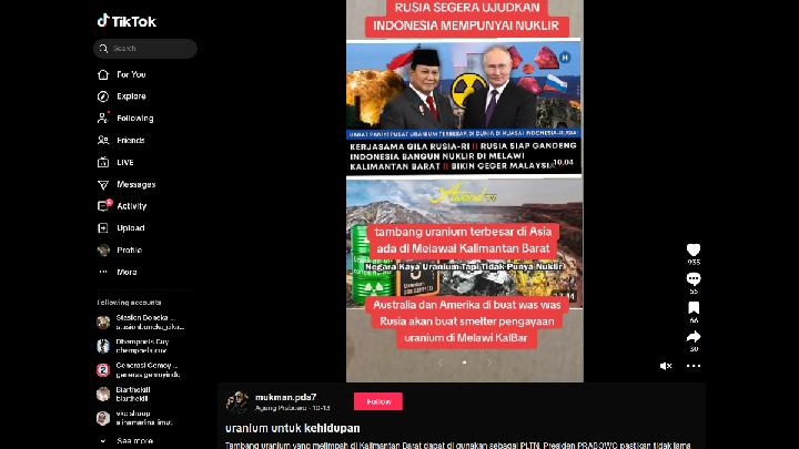 Konten itu menyertakan foto Presiden RI Prabowo Subianto, Presiden Rusia Vladimir Putin, dan ilustrasi tambang uranium. Narasi di dalam konten juga mengklaim Melawi dipilih karena menjadi tambang uranium terbesar di Asia.