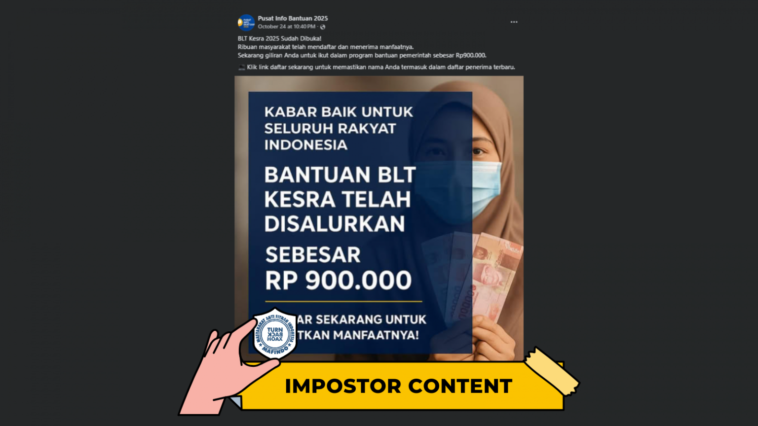 Unggahan berisi tautan “pendaftaran BLT Kesra 2025” yang mengarah ke laman tak resmi itu merupakan konten tiruan (impostor content).Rujukan