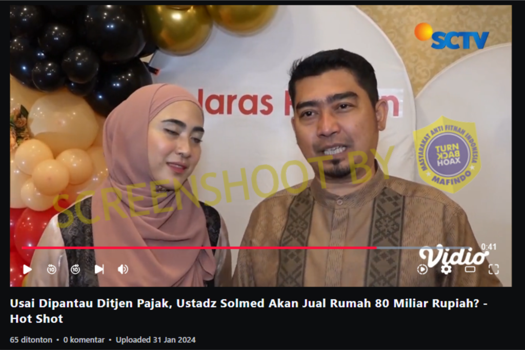 Untuk memastikan kebenarannya, dilakukan pencarian sumber asli video tersebut dengan menggunakan Google Lens. Setelah dilakukan pencarian akhirnya ditemukan video di platform Vidio.com yang berjudul “Usai Dipantau Ditjen Pajak, Ustadz Solmed Akan Jual Rumah 80 Miliar Rupiah? – Hot Shot”, yang mana video ini identik dengan video promosi situs judi tersebut.