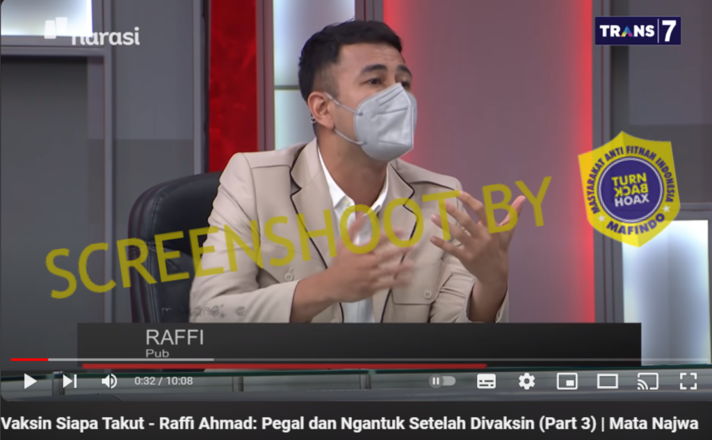 Dengan menggunakan pencarian gambar Google Lens, ditemukan hasil jika potongan video tersebut diambil dari acara Mata Najwa 14 Januari 2021 yang lalu. Dalam episode Mata Najwa tersebut ini, Najwa Shihab, Raffi Ahmad, dan beberapa tamu lainnya hanya membahas mengenai vaksinasi Covid-19 yang pada saat itu baru muncul dan masih menjadi keraguan di masyarakat.