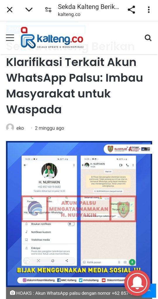 Dapat disimpulkan akun WhatsApp mengatasnamakan Sekretaris Daerah Provinsi Kalimantan Tengah H. Nuryakin merupakan penipuan dan akun tiruan.