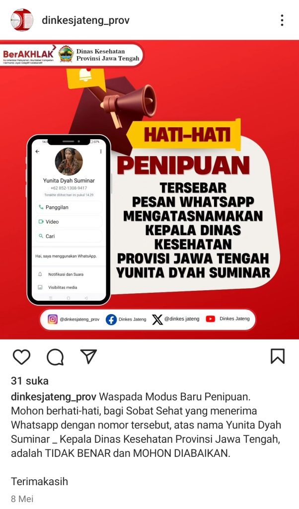 Faktanya akun tersebut bukan milik Yunita Dyah Suminar. Melalui akun Instagram resmi, Dinkes Jateng mengimbau kepada masyarakat untuk berhati-hati terhadap modus penipuan yang beredar.