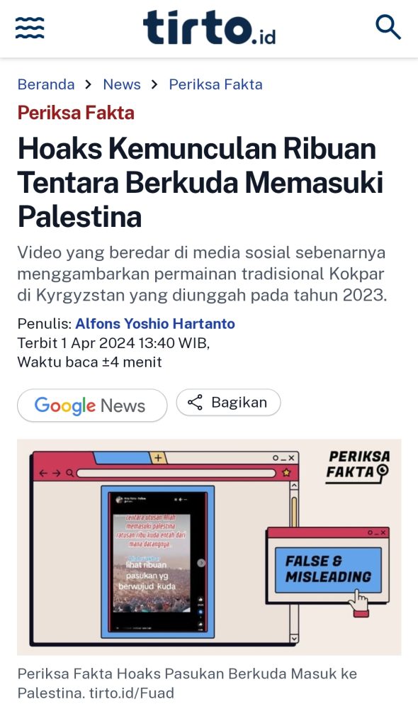 Berdasarkan penjelasan di atas video dengan klaim pasukan berkuda memasuki Palestina adalah keliru dan tidak ada kaitannya dengan konflik antara Israel-Palestina. Dapat disimpulkan unggahan tersebut merupakan konten yang menyesatkan.
