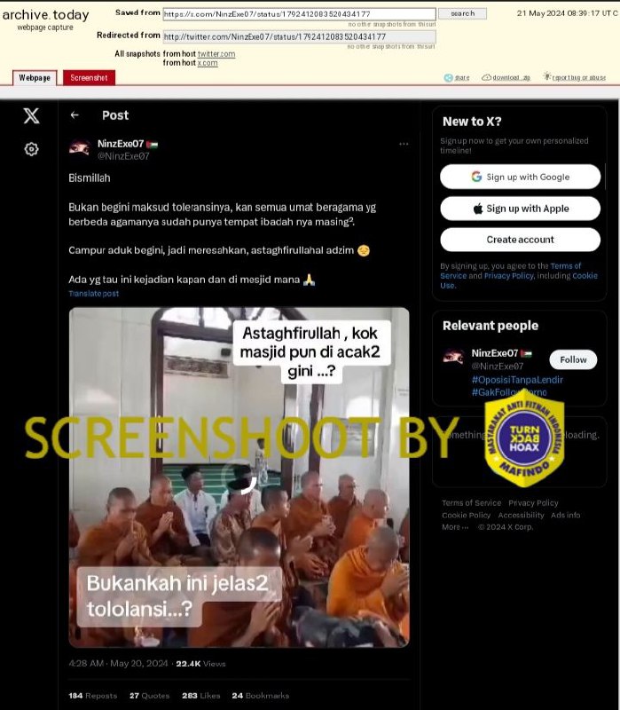 Akun Twitter @NinzExe07 mengunggah video yang menunjukkan beberapa biksu di masjid. Pada video tersebut tertulis narasi “Astaghfirullah, kok masjid pun di acak2 gini?” dan “Bukankah ini jelas2 tololansi?”. Pengguna Twitter itu juga menambahkan keterangan bahwa biksu yang beribadah di masjid ini mulai meresahkan, serta ia bertanya kepada netizen mengenai waktu dan lokasi masjid tersebut. Cuitan dan video yang diunggah pada 20 Mei 2024 tersebut telah disukai hampir 300 orang, dikutip dan dibagikan ulang lebih dari 200 kali, serta telah dilihat lebih dari 22,000 kali.