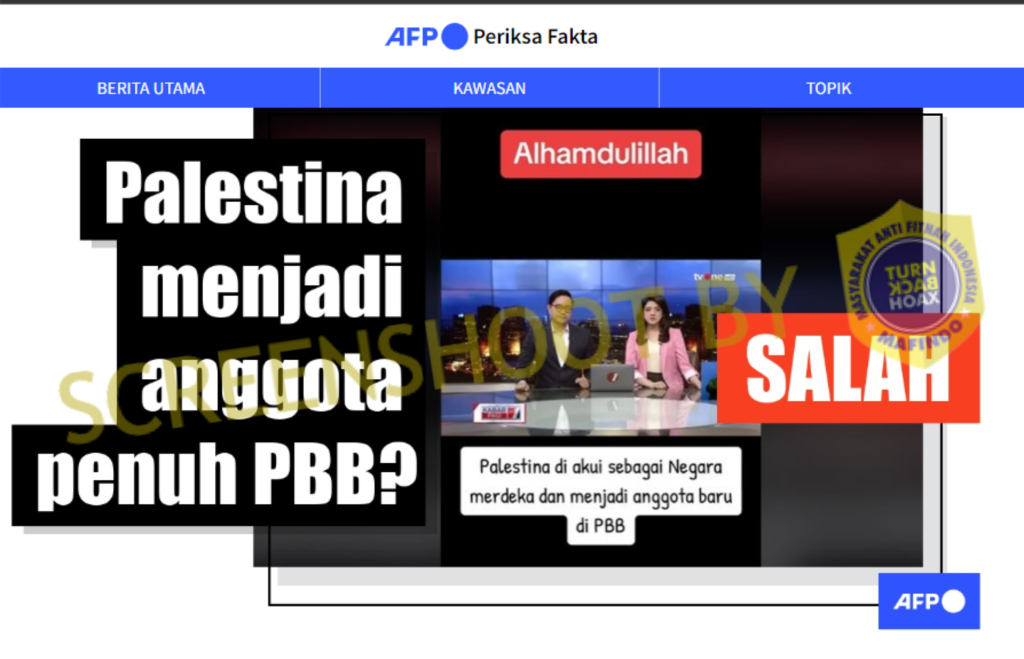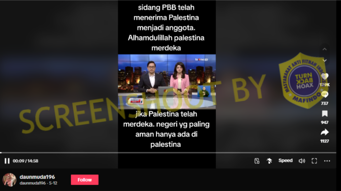 Beredar sebuah video di Tiktok yang membagikan potongan dari acara berita TV One yang mana di awal video, presenter tersebut mengatakan informasi bahwa “Hasil voting sidang pleno PBB memutuskan 143 dari 177 negara menerima Palestina sebagai anggota baru PBB”.