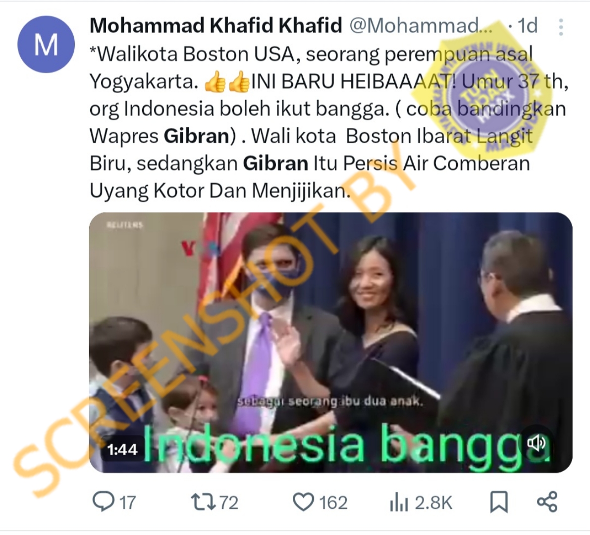 Beredar unggahan melalui media sosial X, sebuah video tentang Walikota Boston, yang disebut merupakan perempuan asal Yogyakarta. Di dalam video tersebut, tampak cuplikan wawancara dan foto-foto pada saat dirinya melakukan tugas sebagai Walikota Boston. Namun apakah benar, perempuan yang disebut berusia 37 tahun ini merupakan perempuan asal Yogyakarta?