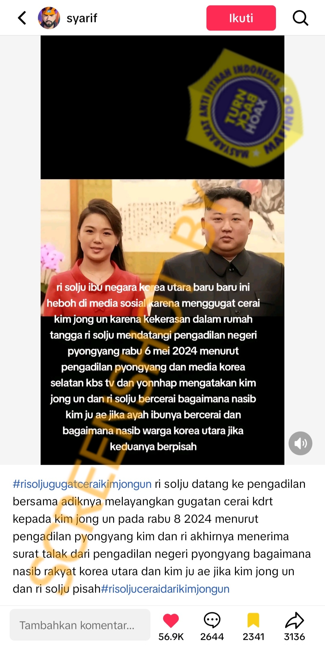 Sebuah unggahan melalui media sosial Tiktok, menampilkan sebuah narasi yang menyebutkan bahwa terdapat masalah di dalam rumah tangga Presiden Korea Utara, Kim Jong Un, dengan istrinya, Ri Sol Ju. Permasalahan ini mengakibatkan Ri Sol Ju mengajukan gugatan cerai terhadap Kim Jong Un, yang kemudian dikabulkan oleh pengadilan negeri Pyongyang. Apakah benar, Kim Jong Un dengan istrinya, Ri Sol Ju telah bercerai di pengadilan negeri Pyongyang?