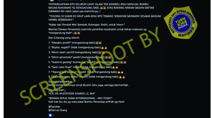 Beredar unggahan di Facebook dengan klaim produk bumbu masakan mengandung babi. Terdapat sejumlah produk yang diklaim positif mengandung babi, yakni Masako, Sasa, Ajinomoto dan bumbu dalam mi instan goreng Indomie.