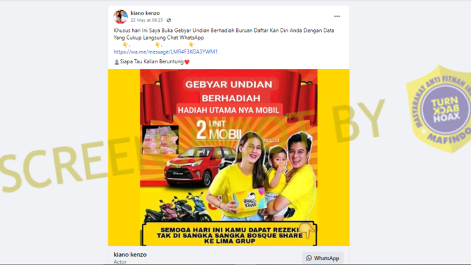 Ditemukan sebuah unggahan di Facebook bernama โkiano kenzoโ membagikan unggahan mengenai pendaftaran gebyar undian berhadiah dari Baim Wong dan sekeluarga. Pada bagian caption unggahan juga tertera sebuah link Whatsapp untuk mendaftar di undian tersebut.