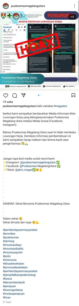 (GFD-2024-19847) [SALAH] Postingan Facebook Lowongan Kerja Puskesmas Magelang Utara