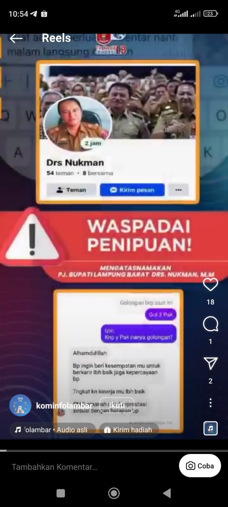 Beredar sejumlah akun Facebook yang memasang nama dan foto profil Pj Bupati Lampung Barat. Akun Facebook dengan nama “Drs Nukman” mengirimkan pesan ke salah satu ASN menanyakan golongan dan menawarkan kenaikan jabatan.