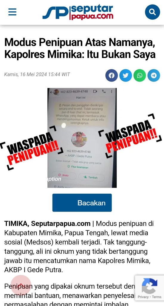 Kapolres juga mengimbau kepada masyarakat agar berhati-hati dan tidak mudah tertipu terhadap aksi penipuan yang mengatasnamakan pejabat. Maka akun WhatsApp Kapolres Mimika AKBP I Gede Putra