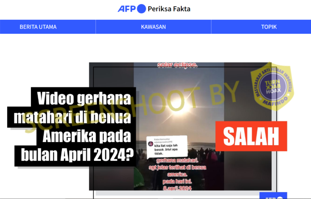 Menyadur dari artikel AFP yang juga membahas klaim serupa, diketahui jika video yang beredar tersebut bukan merupakan kejadian gerhana matahari yang terjadi pada 8 April 2024 kemarin.