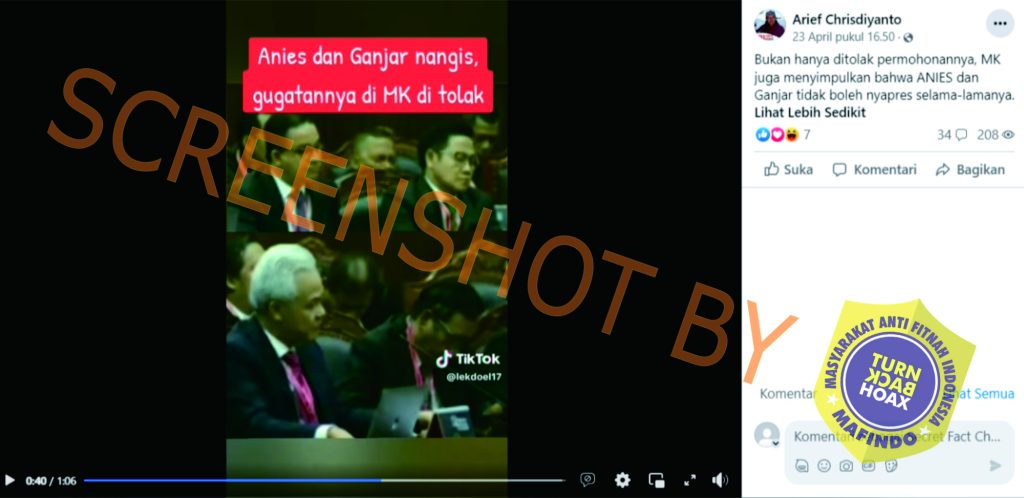 Beredar sebuah postingan Facebook yang mengklaim bahwa Anies Baswedan dan Ganjar Pranowo tidak diizinkan kembali untuk mencalonkan diri sebagai presiden Republik Indonesia, hal tersebut berdasarkan dari kesimpulan MK. Dalam postingan tersebut juga menyertakan video yang menunjukkan suara hakim MK saat membacakan putusan sengketa hasil Pilpres 2024.
