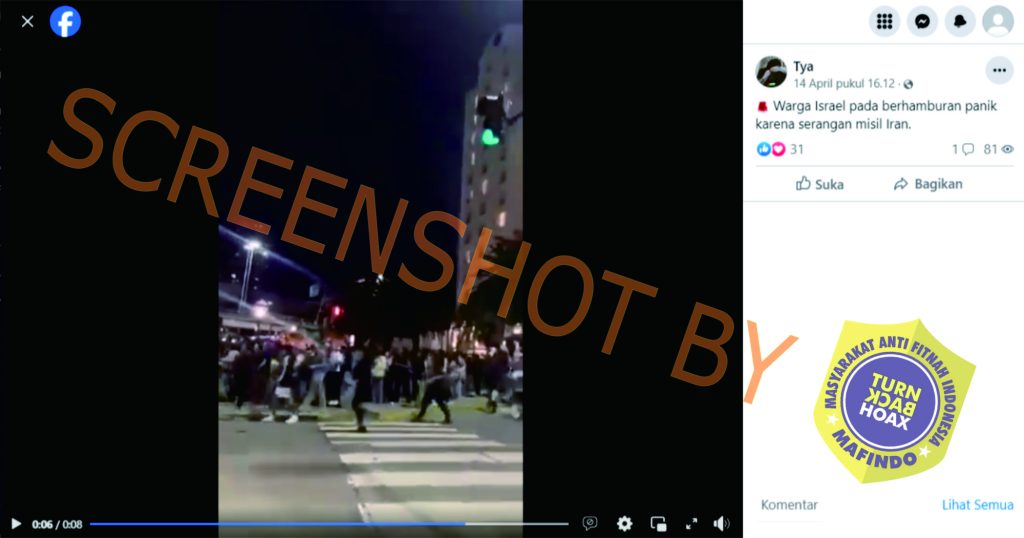 Beredar sebuah video yang menunjukkan sekumpulan warga berlarian panik yang diklaim merupakan detik-detik saat Iran menyerang Israel. Diketahui Iran menyerang Israel pada 14 April 2024 sebagai balasan serangan Israel terhadap Konsulat Iran di Damaskus pada 1 April.