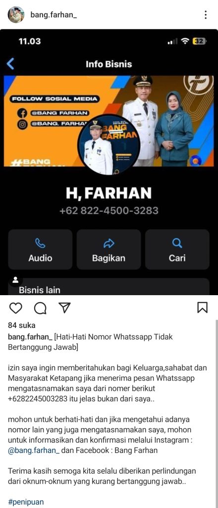 Setelah ditelusuri, akun Instagram Farhan @bang.farhan_ mengunggah tangkapan layar akun palsu tersebut dan mengimbau kepada masyarakat untuk berhati-hati terhadap pihak yang tidak bertanggungjawab mengatasnamakan dirinya.