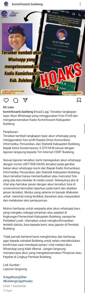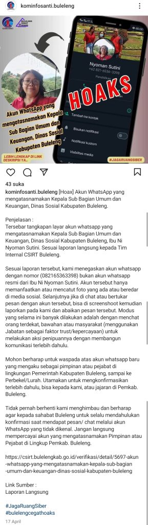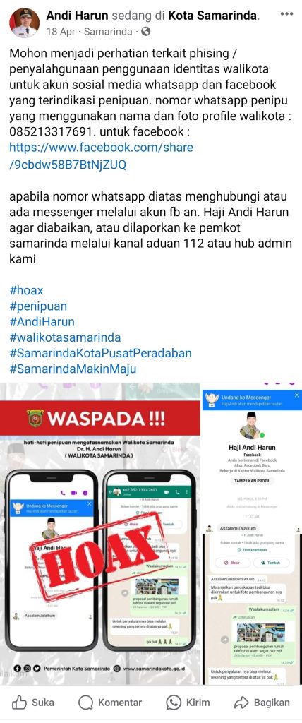 “Mohon menjadi perhatian terkait phising / penyalahgunaan penggunaan identitas walikota untuk akun sosial media whatsapp dan facebook yang terindikasi penipuan. nomor whatsapp penipu yang menggunakan nama dan foto profile walikota : 085213317691. untuk facebook : https://www.facebook.com/share/9cbdw58B7BtNjZUQ”,” kata Andi Harun dalam postingan Facebooknya.