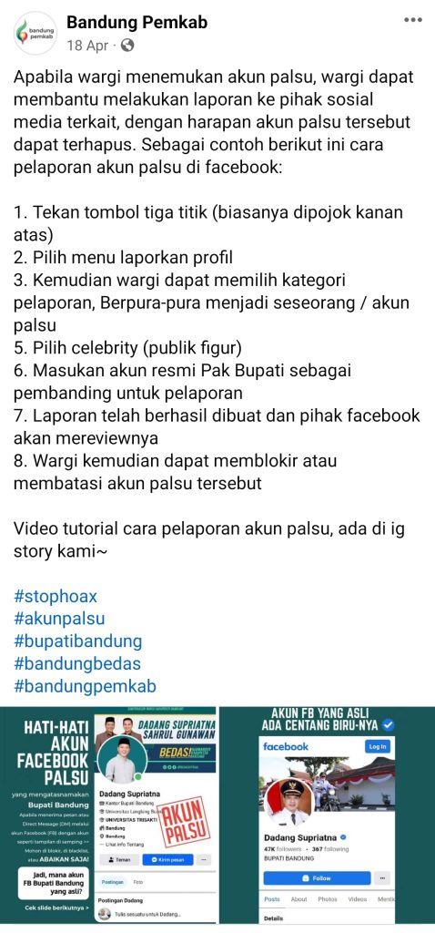 Akun Facebook pribadi milik Bupati yaitu Dadang Supriatna bercentang biru Pemkab Bandung meminta masyarakat mereport akun palsu tersebut.