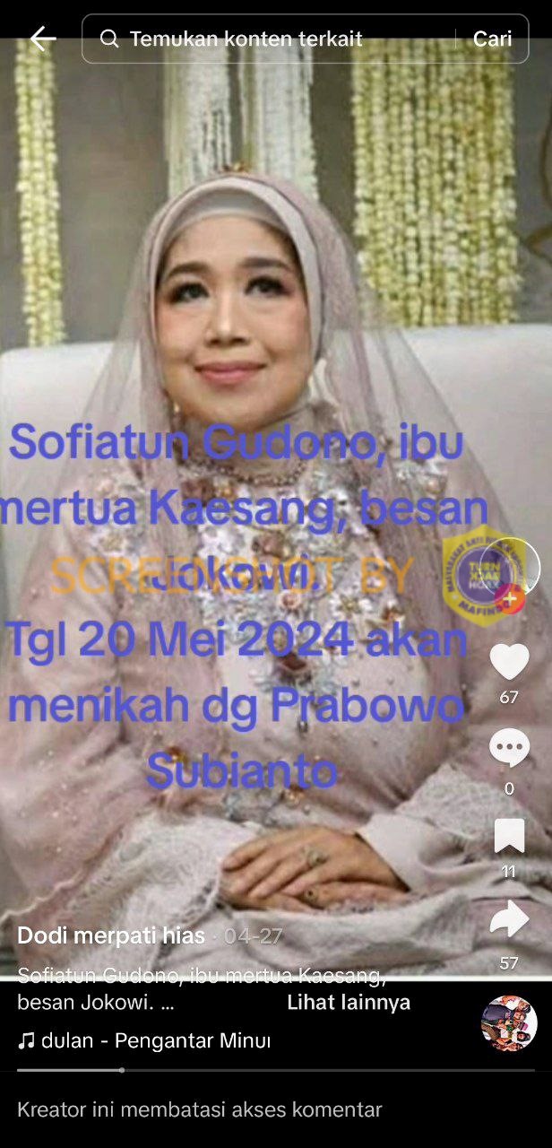 Akun Tik Tok dodi.piliang memposting sebuah video yang di dalamnya terdapat gambar Sofiatun Gudono yang merupakan mertua dari Kaesang Pangarep. Pada video berdurasi 3 menit 49 detik tersebut disertai narasi bahwa Sofiatun Gudono akan menikah dengan Prabowo Subianto tanggal 20 Mei 2024.