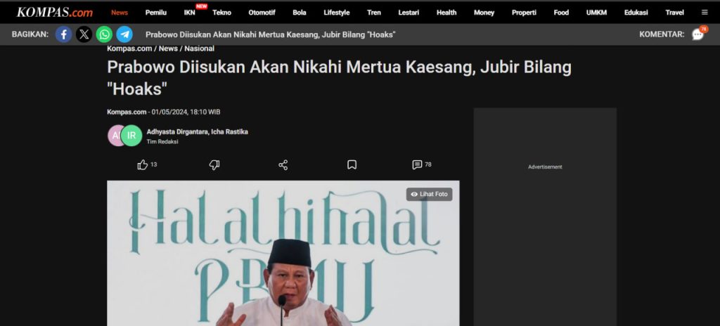 Setelah ditelusuri dengan menuliskan kata kunci Sofiatun Gudono menikah dengan Prabowo Subianto ditemukan beberapa artikel salah satunya dimuat oleh Kompas berjudul “Prabowo Diisukan Akan Nikahi Mertua Kaesang, Jubir Bilang “Hoaks”” 1 Mei 2024 pukul 18.10 WIB. Informasi bahwa Prabowo menikahi besan Presiden Joko Widodo, Sofiatun Gudono merupakan hoaks hal tersebut diungkapkan oleh juru bicara presiden terpilih 2024-2029 Prabowo Subianto, Dahnil Anzar Simanjuntak.