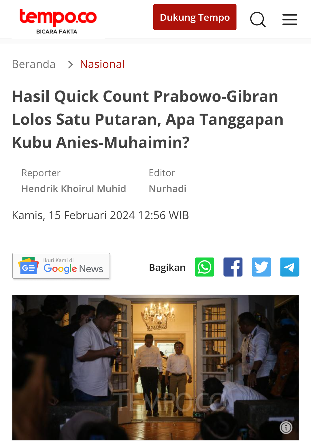 “Dengan perolehan suara sebanyak 96.214.691 suara atau 58,59 persen dari total suara sah nasional dan memenuhi sedikitnya 20 persen suara di setiap provinsi yang tersebar di 38 provinsi,” kata Hasyim. Keunggulan Prabowo-Gibran dari paslon capres-cawapres lain, Anies Baswedan-Muhaimin Iskandar dan Ganjar Pranowo-Mahfud MD, sesungguhnya juga telah terprediksi dari hasil quick count, setelah pemilihan hari Rabu, 14 Februari 2024, yang juga diberitakan Tempo.