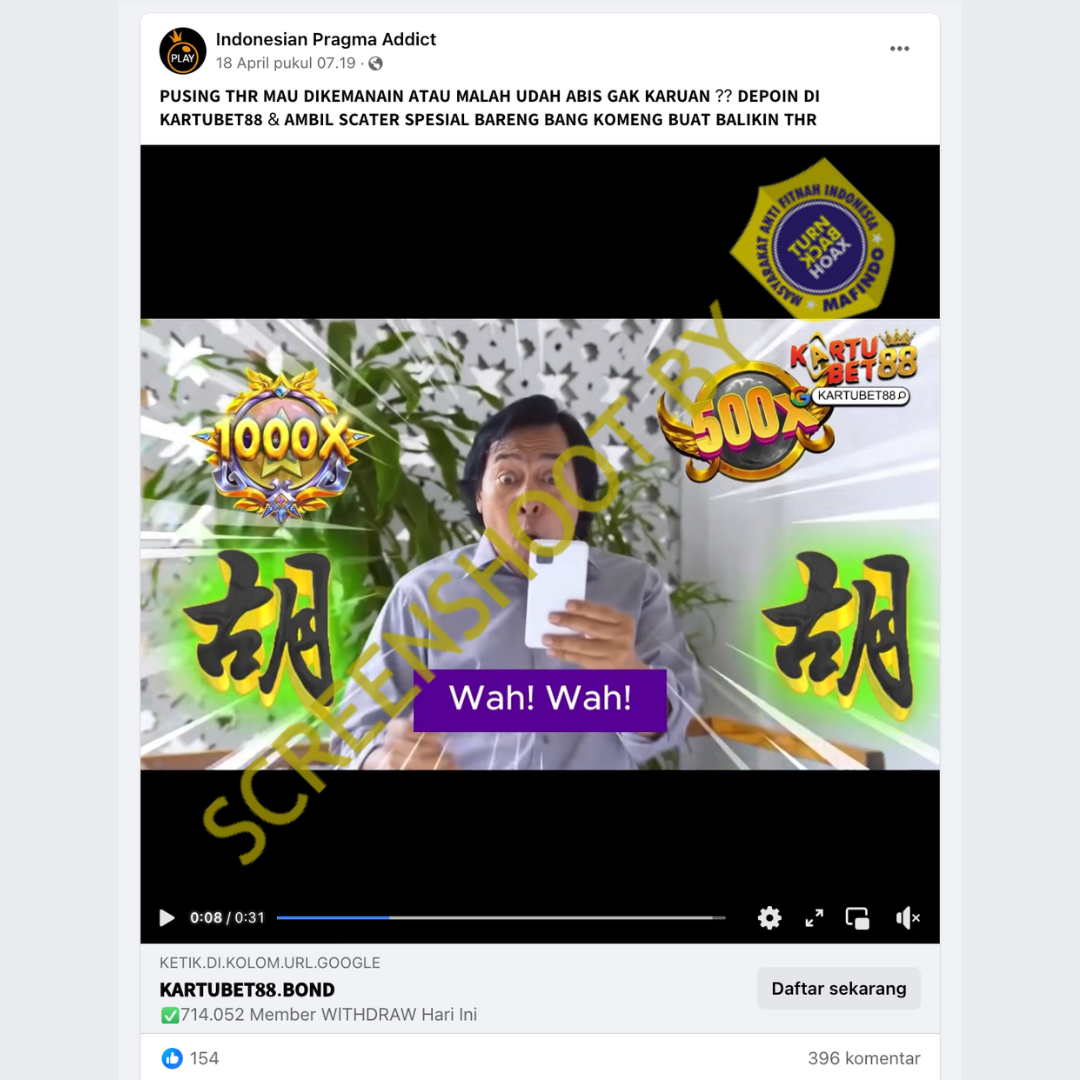 Akun Facebook Indonesian Pragma Addict membagikan video yang berisi promosi situs judi online. Dalam video dan narasi unggahan tersebut menampilkan komedian Komeng yang sedang mempromosikan situs judi online.