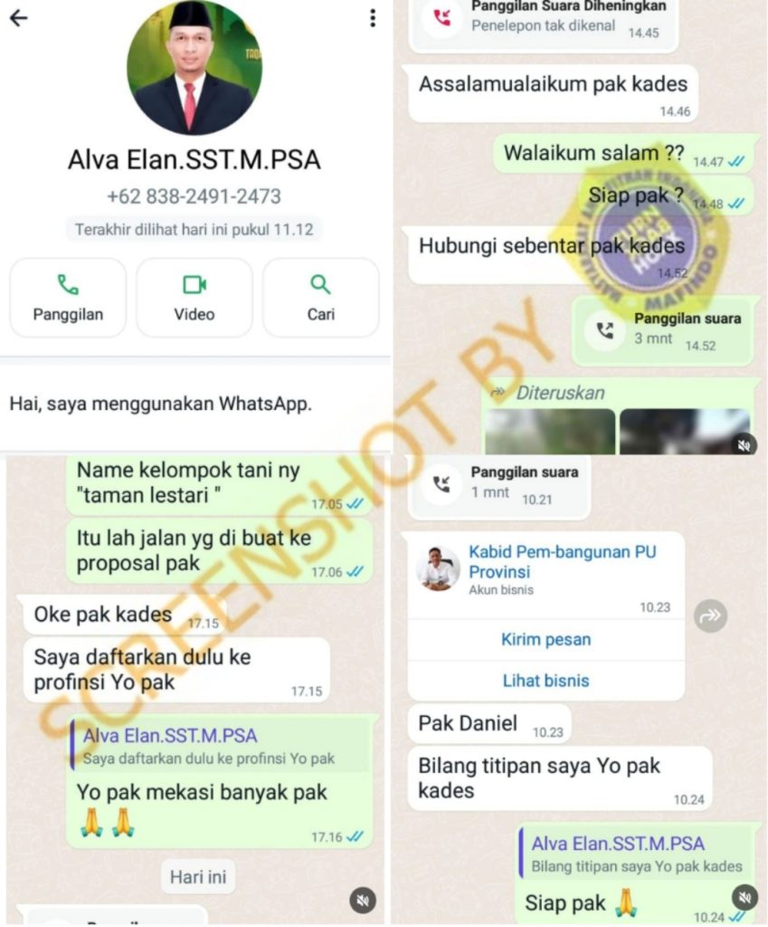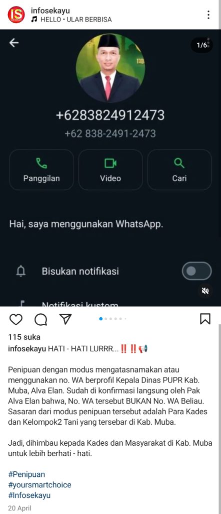 Beredar akun WhatsApp bernomor 0838 2491 2473 memasang foto profil dan nama Alva Elan selaku Kepala Dinas PUPR Kab. Muba. Akun tersebut menghubungi para kades dan kelompok tani diminta mengirimkan proposal bantuan yang akan di daftarkan pada program bantuan provinsi.