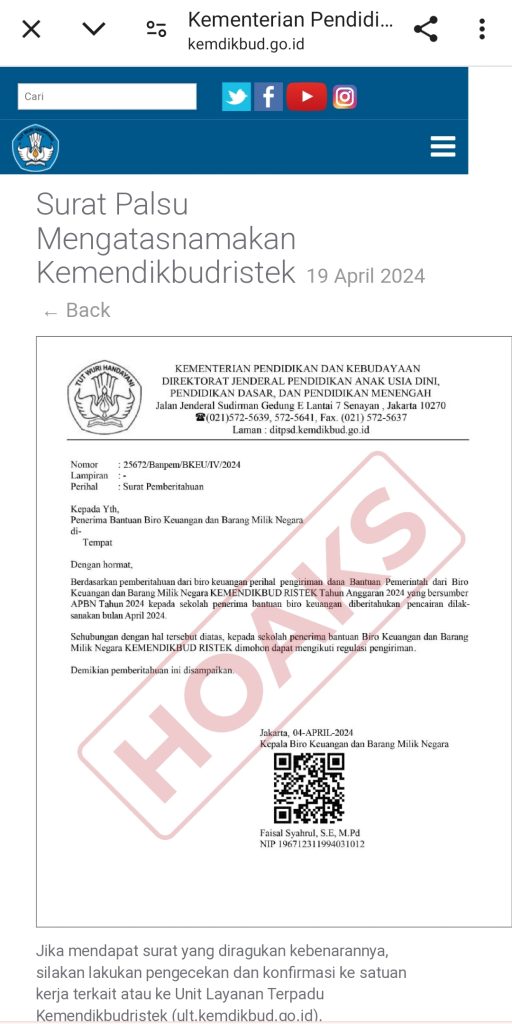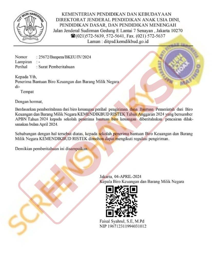 Tersebar surat bernomor 25672/Banpen/BkKEU/IV/2024 mengatasnamakan Kemendikbud Ristek terkait surat pemberitahuan ditujukan kepada penerima bantuan Biro Keuangan dan Barang Milik Negara. Dalam surat dilengkapi kop surat Kemendikbud dan Ditjen Anak Usia Dini Pendidikan Dasar, dan Pendidikan Menengah. Isi surat tersebut menerangkan pencarian bantuan dilaksanakan pada bulan April 2024.