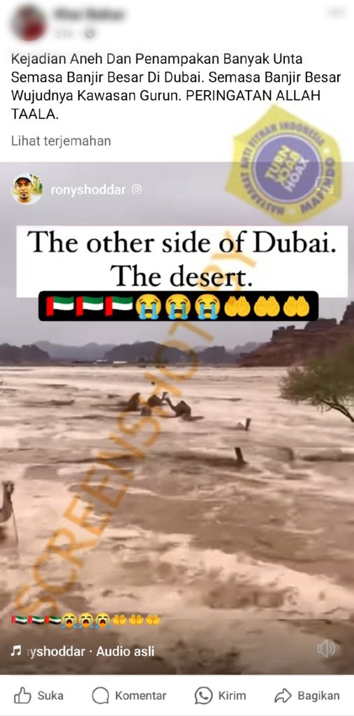 Beredar di media sosial potongan video berdurasi salah satunya di akun Facebook. Pada unggahan video tersebut memperlihatkan kawanan unta terjebak banjir yang diklaim terjadi di Dubai “Kejadian Aneh Dan Penampakan Banyak Unta Semasa Banjir Besar Di Dubai.”