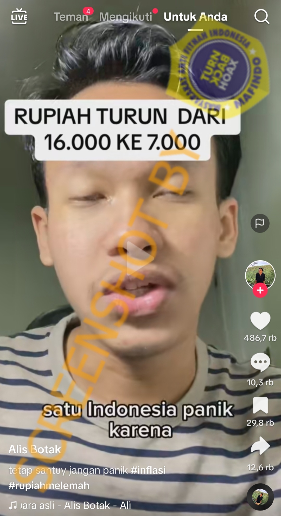 Sebuah video di media sosial Tiktok, membagikan sebuah video dengan klaim judul cukup menarik. Akun bernama Alis Botak ini, mengunggah video dirinya sambil mengulas topik sesuai dengan judul yang diberikan, yaitu: "RUPIAH TURUN DARI 16.000 KE 7.000". Lalu apakah benar nilai Rupiah telah turun sesuai dengan klaim judul tersebut?