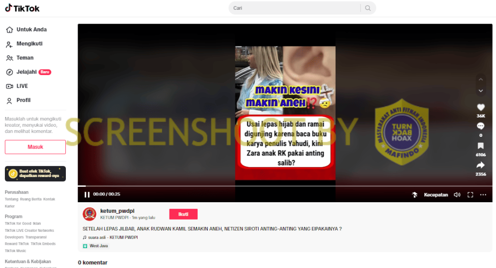 Akun TikTok @ketum_pwdpi mengunggah video yang mengklaim Camilia Laetitia Azzahra, anak Ridwan Kamil memakai anting simbol Salib di telinganya. Banyak warganet yang percaya jika foto itu adalah telinga Zara. Akun TikTok @srirohayati5260 berkomentar "berarti udah pindah agama" selain itu @yayiyuyeyo07 juga turut berkomentar "Sangt di sayng kan... pk ridwan kamil merancang masjid bgtu byk tp ank nya jdi bgtu" dan masih terdapat 5 ribu komentar lainnya pada unggahan ini.