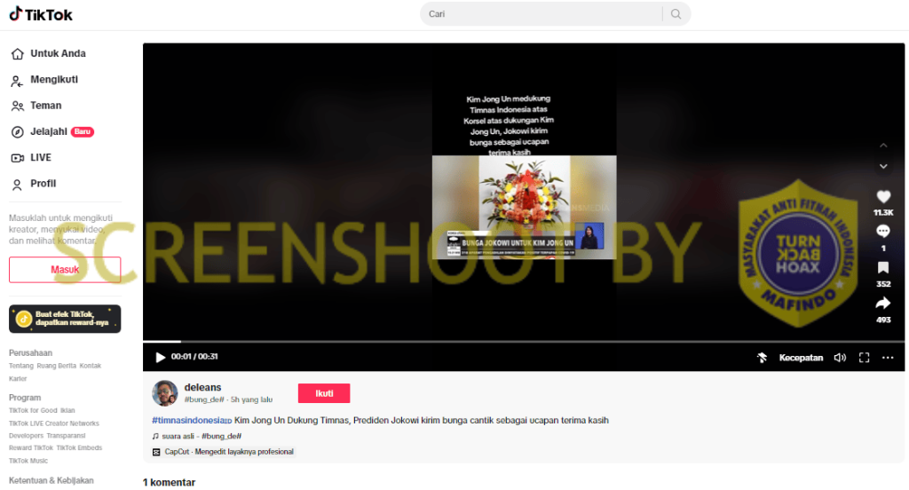 Akun TikTok @deleans, mengunggah video yang mengklaim jika Jokowi kirimkan bunga ucapan terima kasih untuk Kim Jong Un karena sudah mendukung Timnas Indonesia Lawan Korea Selatan. Video itu menampilkan sebuah foto karangan bunga warna warni.