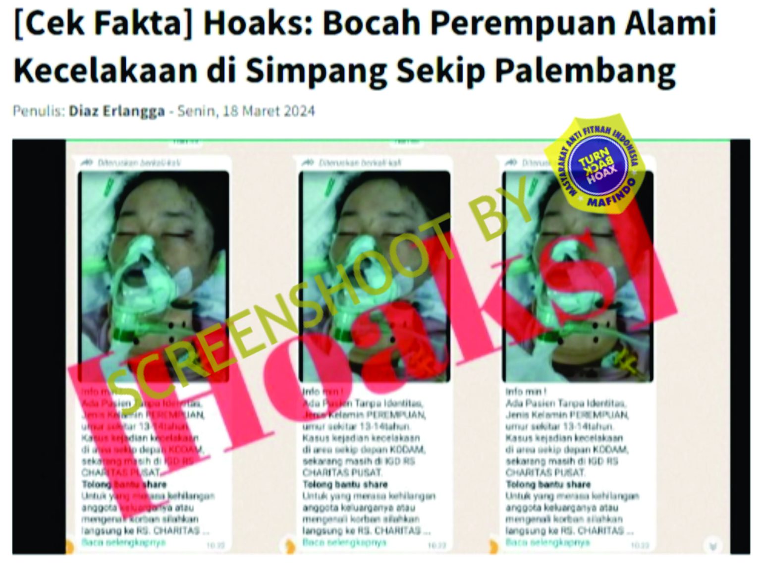Mengenai hal ini pihak Kepolisian Palembang memberikan klarifikasi mengenai unggahan tersebut. Klarifikasi tersebut dapat kita baca melalui artikel dari Sumsel Update berjudul “[Cek Fakta] Hoaks: Bocah Perempuan Alami Kecelakaan di Simpang Sekip Palembang”.