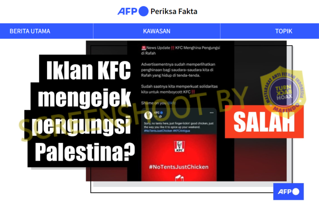 Beredar sebuah unggahan di Snack Video berisi mengenai tangkapan layar status media sosial KFC yang mengatakan tentang “Maaf tak ada tenda di sini, yang ada hanya daging ayam yang lezat…” kalimat tersebut kemudian dikaitkan dengan para pengungsi Palestina akibat dari meledak kembalinya konflik Israel-Palestina di akhir tahun 2023 kemarin.