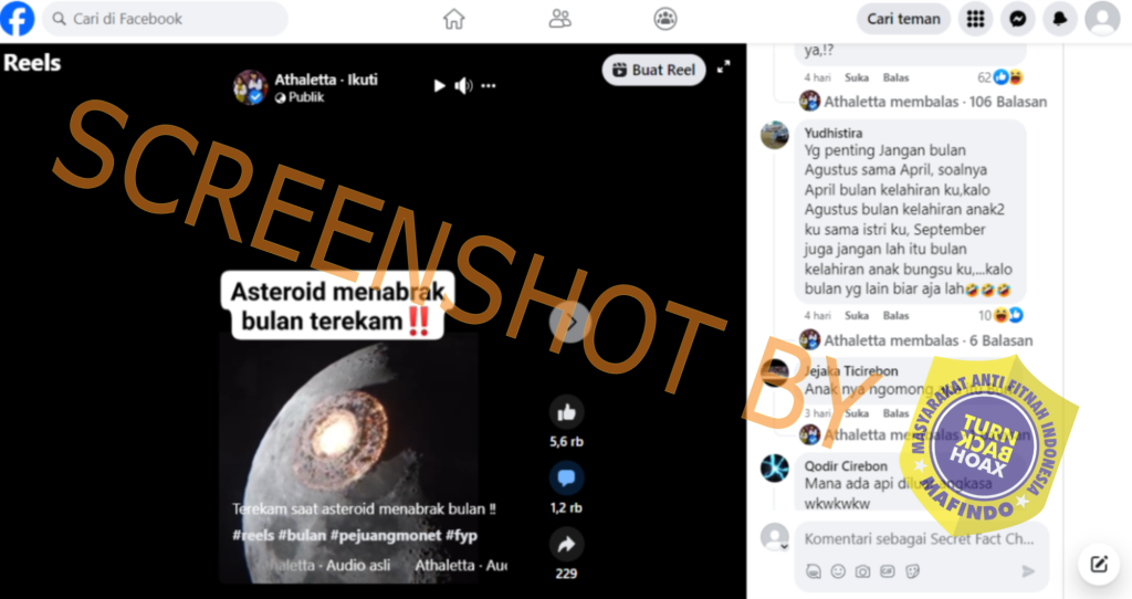 Beredar di Facebook sebuah video yang diklaim merupakan rekaman asteroid menabrak bulan, tabrakan dalam video tersebut menimbulkan ledakan besar di sebagian bulan.