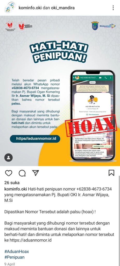 Bagi masyarakat yang dihubungi nomor tersebut dengan maksud meminta bantuan donasi dan lainnya untuk berhati-hati! dan diminta untuk melaporkan nomor tersebut ke https://aduannomor.id,” tulis Kominfo Oki pada akun Instagramnya (09/04).