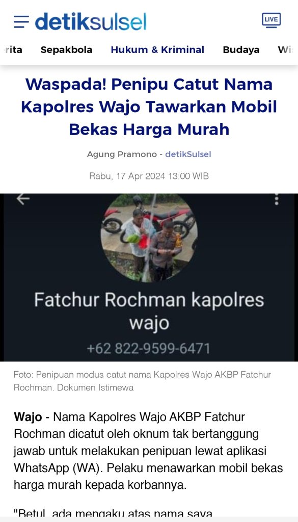 Beredar nomor WhatsApp 0822 9599 6471 menggunakan nama dan foto Fatchur Rochman Kapolres Wajo yang diambil dari media sosial. Akun tersebut menawarkan mobil bekas dengan harga yang sangat murah. Modus yang digunakan meminta dana sebagai pembayaran awal.