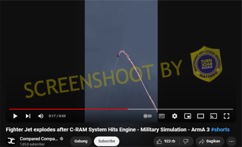Setelah dilakukan penelusuran dengan Google Lens, potongan video tersebut identik dengan video berjudul โFighter Jet explodes after C-RAM System Hits Engine โ Military Simulation โ ArmA 3 #shortsโ yang diunggah oleh akun Youtube Compared Comparison pada 28 Juni 2023 lalu.