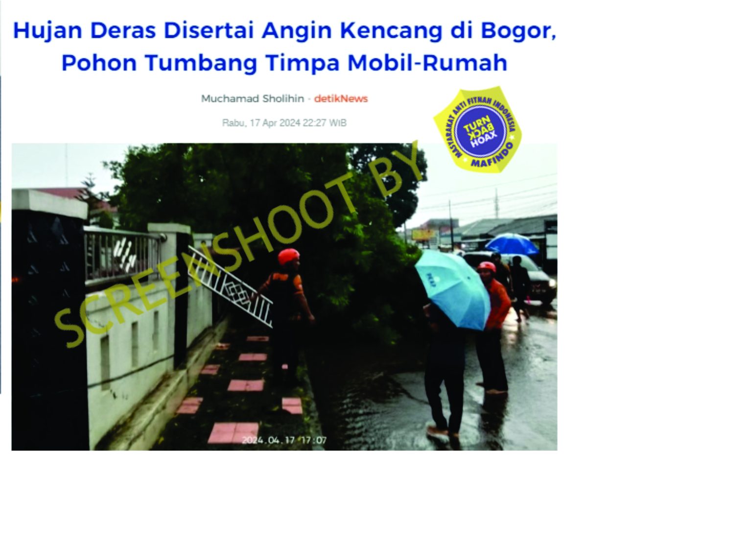 Namun, setelah disimak ternyata narator hanya membacakan sebuah artikel yang diunggah oleh Detik.com yang berjudul “Hujan Deras Disertai Angin Kencang di Bogor, Pohon Tumbang Timpa Mobil-Rumah”. Dalam artikel tersebut tidak dijelaskan bahwa terjadi angin kencang yang menerjang ratusan rumah di Bogor.