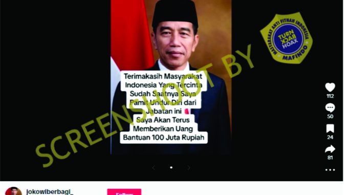 Tidak benar bahwa Presiden Jokowi memberikan uang 100 juta sebagai hadiah lepas jabatan sebagai presiden, akun yang mengatasnamakan Jokowi tersebut dapat diindikasi sebagai akun penipuan.