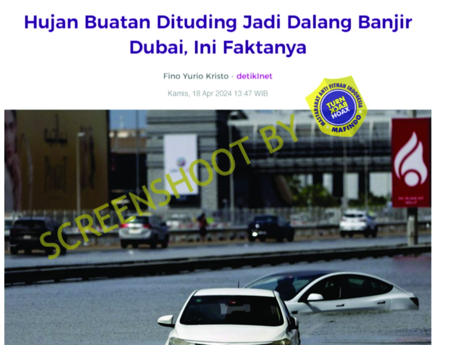 Namun, klaim tersebut rupanya tidak benar. Melansir dari artikel DetikInet yang juga membahas isu ini, disebutkan jika banjir di Dubai ini tidak disebabkan oleh adanya hujan buatan. National Center of Meteorology (NCM), satgas pemerintah yang bertanggung jawab atas misi penyemaian awan di UEA, mengatakan pihaknya tidak melakukan teknik modifikasi cuaca menjelang terjadinya badai besar di Dubai. Mereka memastikan tidak mengirimkan pilot untuk operasi penyemaian sebelum atau selama badai yang melanda.
